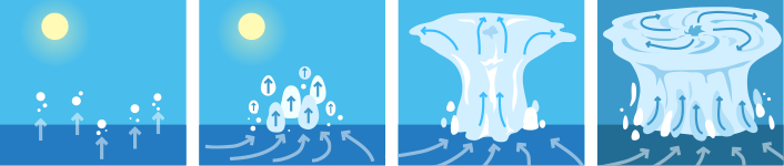 - 廣大的海面海水面溫度在27°C或以上,如此始有足夠的水汽,藉蒸發進入空氣,將蒸發潛熱帶進空氣。