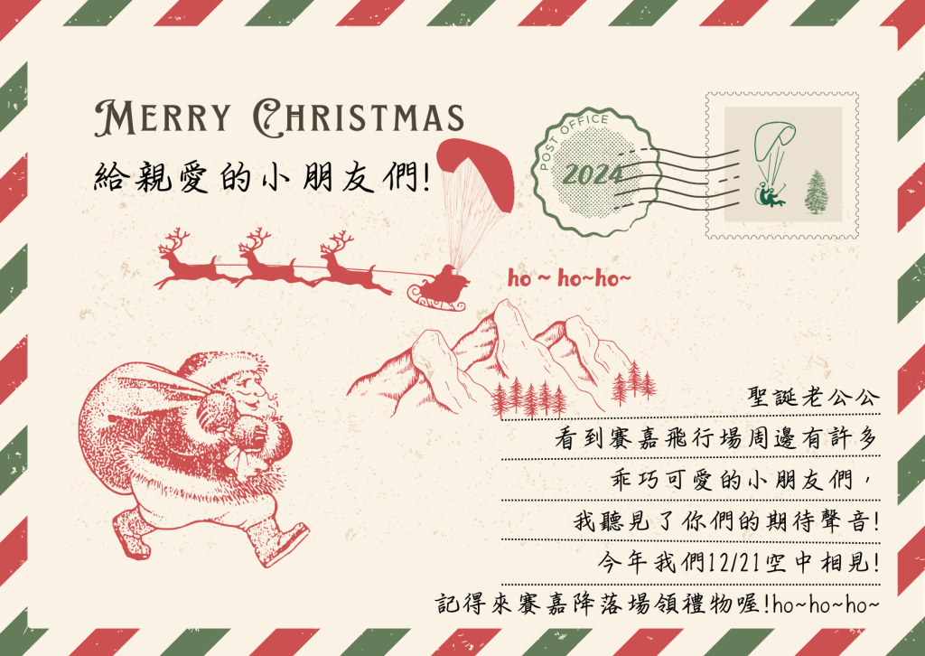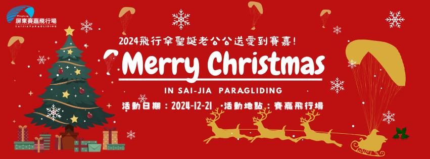 為了讓小朋友們有個難忘又美好的童年,我們決定重現這樣的活動,讓各位傘們成為小朋友們的聖誕老公公,飛行傘空中發放禮物,慶祝這每年一年一次的「賽嘉飛行傘聖誕」,一起渡過這個最美好幸福又別具特別意義的一天。