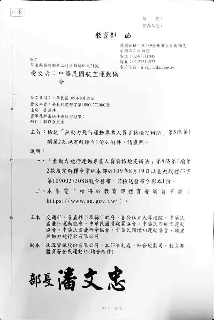 【體育署「無動力飛行運動專業人員資格檢定辦法」解釋令】 分類:蘇沛倫26 八月 202026 八月 2020發表於未分類 分享此文: 按一下即可分享至 X(在新視窗中開啟) X 按一下以分享至 Facebook(在新視窗中開啟) Facebook 喜歡 正在載入... 相關